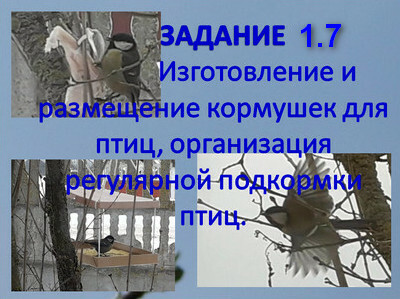 7.;1.7. Изготовление и размещение кормушек для птиц, организация регулярной подкормки птиц;Ноябрь-март;Цветков С.Ф., Железная Г.В.;1. Составить отчёт о количестве и разнообразии птиц, прилетающих на кормушки. <br>2. Фотоотчет разместить на сайте учреждения образования. <br>3. Составить отчет об участии в национальной акции «Зимние учеты птиц». <br>4.Указать дату выполнения задания и участников.